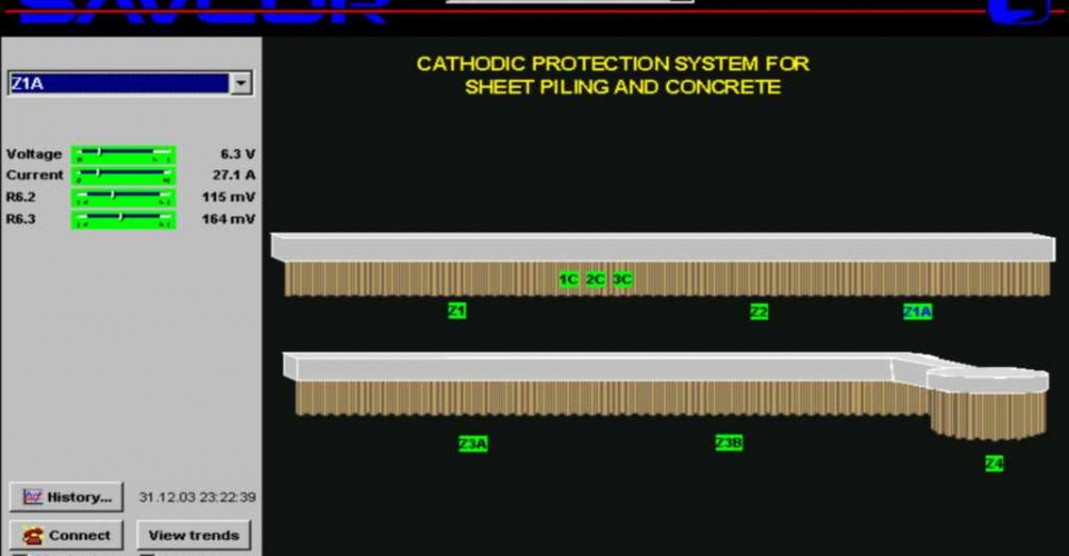 First installation of CP to a new reinforced concrete Structure. CP of the new and existing sheet piling wall, 410 m long, with remote control and monitoring system.